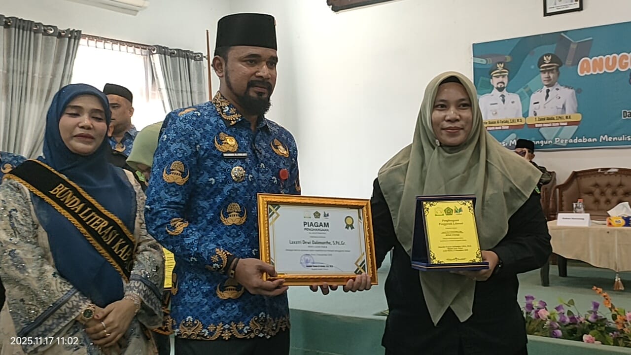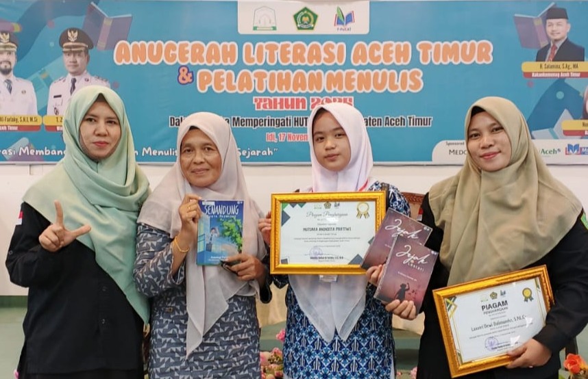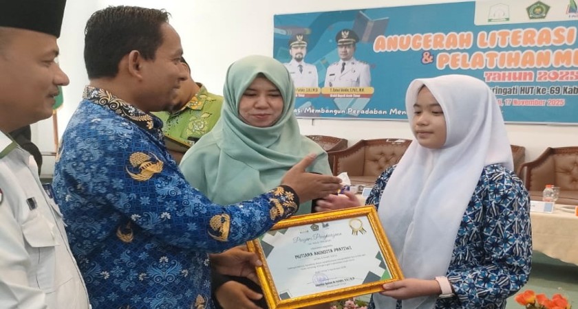 Aceh Timur (17/11) - Mutiara Anindita Pratiwi, siswi dari MTsN 3 Aceh Timur, menorehkan kebanggaan dengan menerima Anugerah Literasi untuk kategori penulis buku Antologi. Penghargaan ini diberikan dalam acara puncak Anugerah Literasi dan Pelatihan Menulis yang diselenggarakan oleh Forum Penulis Kemenag Aceh Timur (F_PEKAT) tahun 2025.